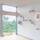 木目のフローリング、グレーの壁で、シンプルかつ落ち着いた雰囲気のデザイン。冬は南側の大きな窓からは太陽光がたっぷり届き、暖房無しでも20℃を超える室温になることも!