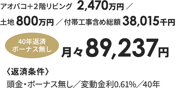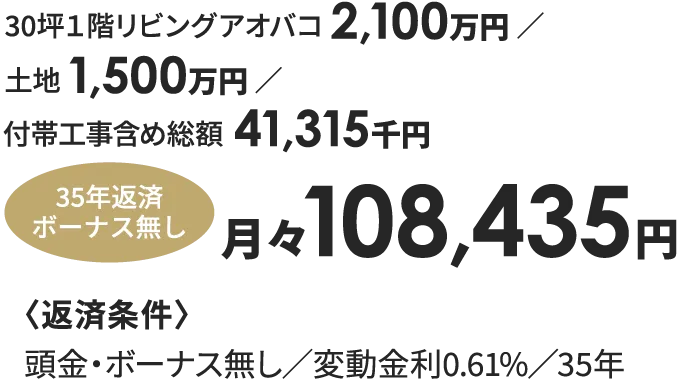 • ※支払例は、本体1,850万円/土地1,250万円/ 諸費用300万円を全額借入し、金利0.7%・40年返済で計算した金額です。
