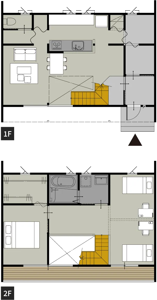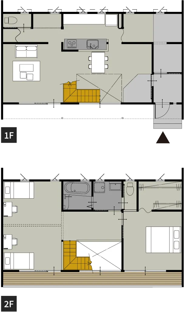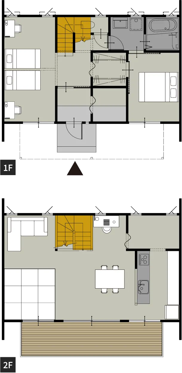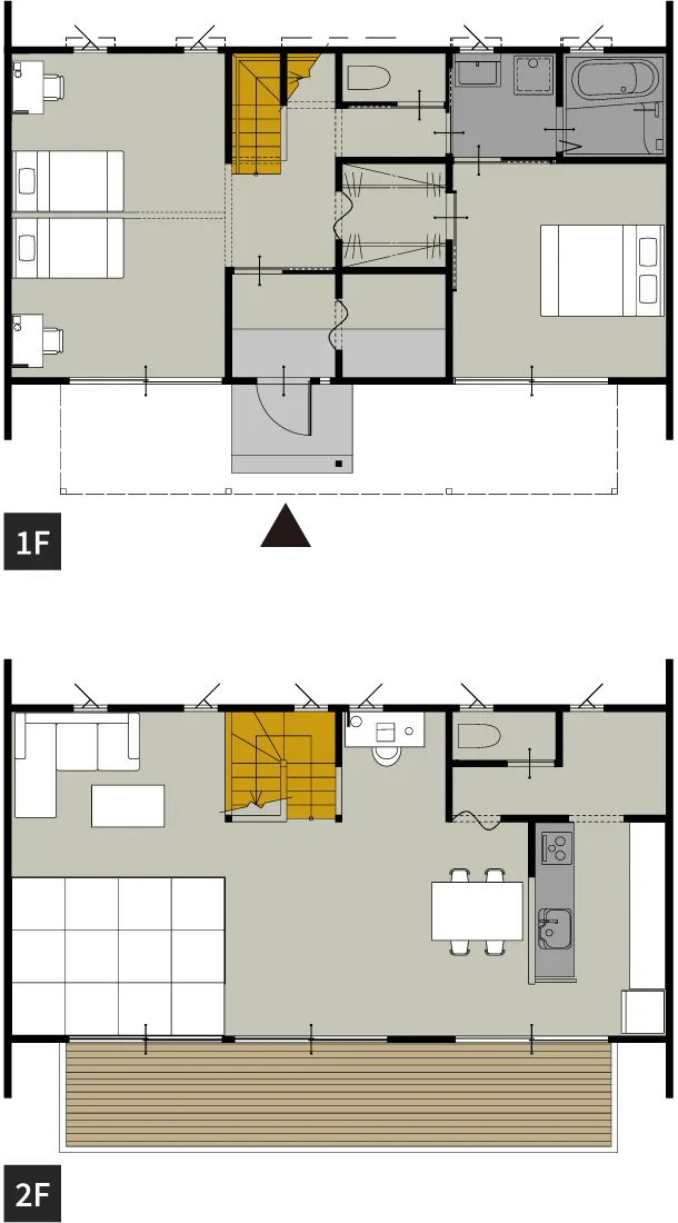 1階に水回りと寝室、2階にリビングを配置したプラン。太陽光がたっぷりと入り、冬でも明るく暖かい空間に。広々バルコニーで自然を身近に感じられるのも◎