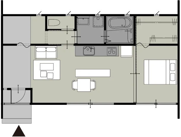 コンパクトな1LDKの間取りなので、ご夫婦の第二のマイホーム、独身の方など、幅広い方の暮らしにフィットします。アウトドア用品や自転車も置ける広々土間もあり!
